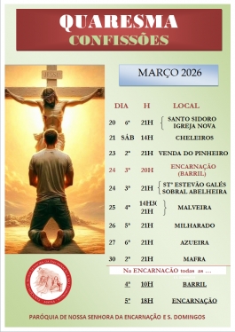 Calendário das celebrações penitênciais na vigararia de Mafra. Na paróquia da Encarnação, no dia 24, será na igreja do Barril.